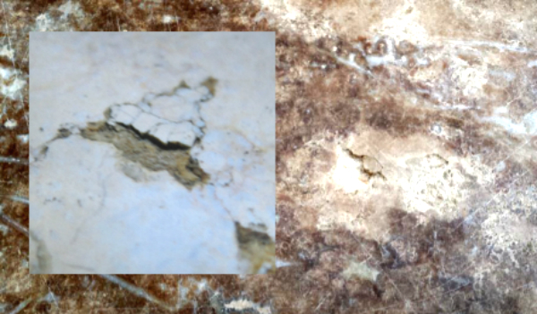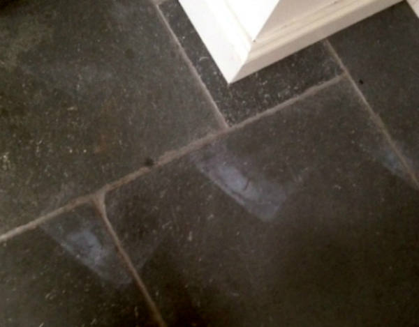 Hier wird die Versiegelungsschicht beeinträchtigt, da Feuchtigkeit in die Oberfläche eindringt und Adern und Steinrisse hervorhebt, die ansonsten unsichtbar oder weniger sichtbar wären.