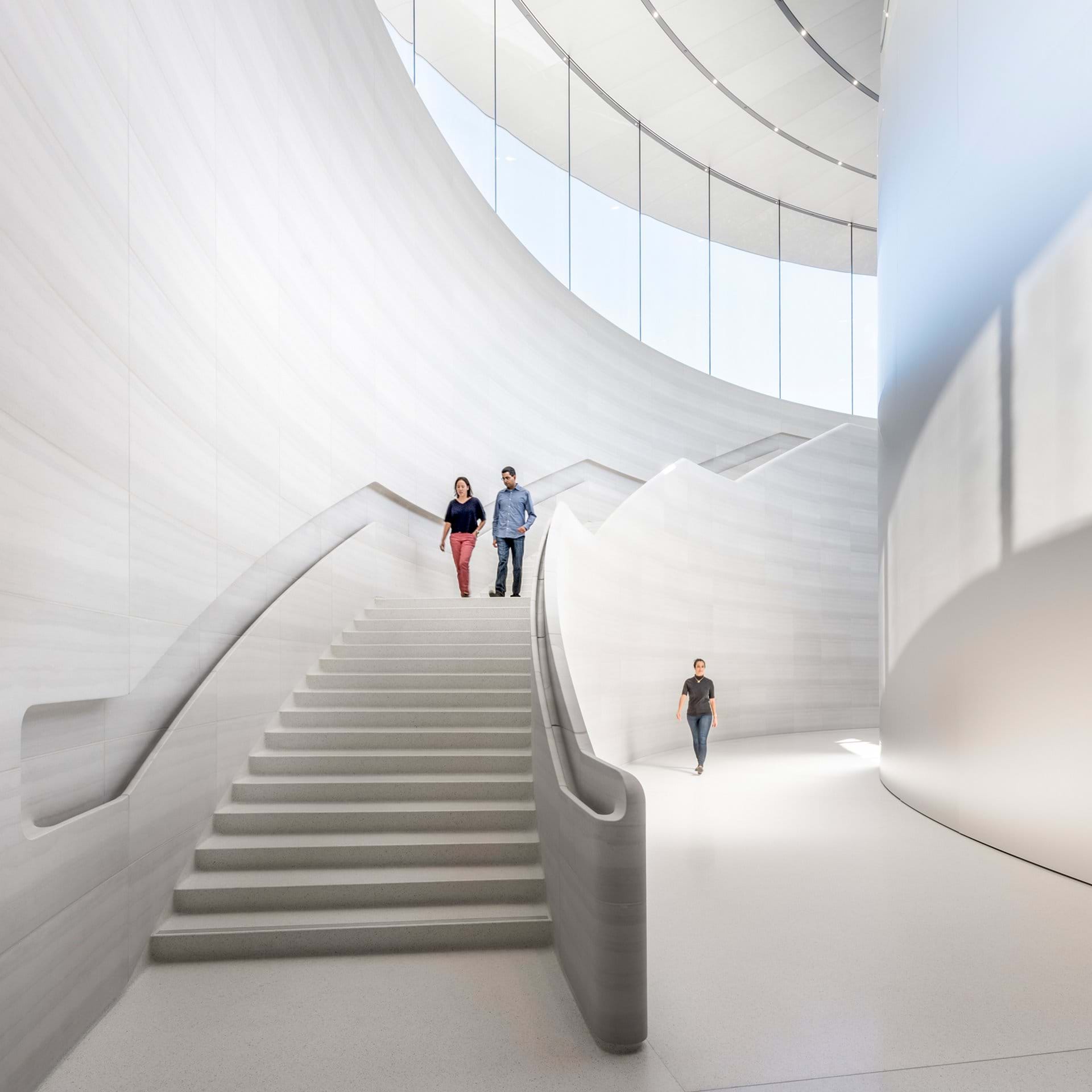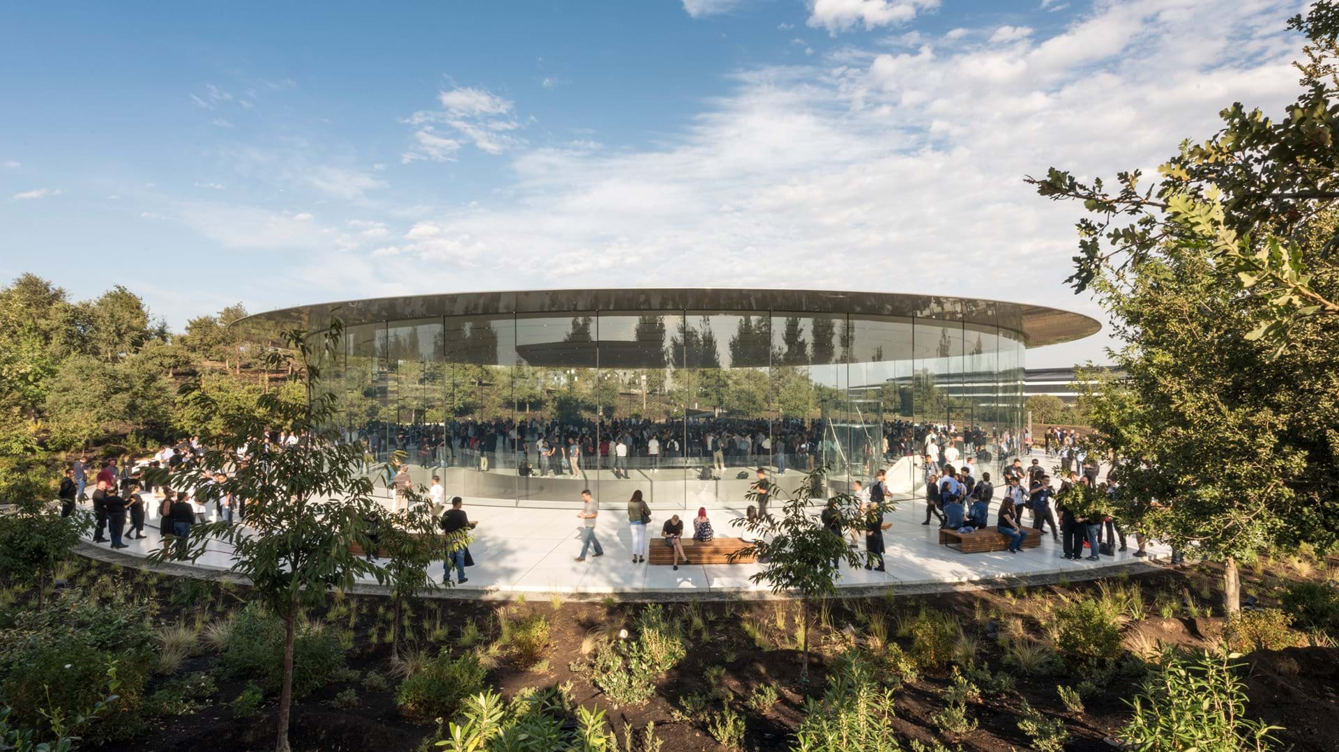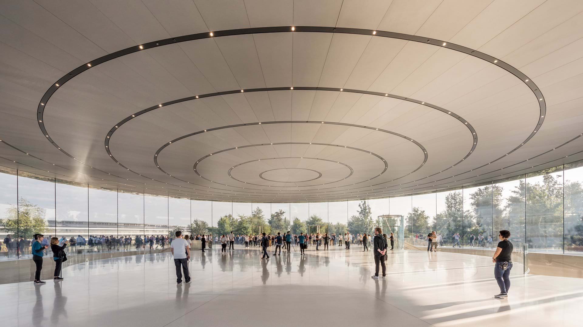Die Glaswände des Steve Jobs Theatre ermöglichen den Besuchern einen perspektivischen Blick auf den Apple Park, und sein hoher Glasaufzug ist der weltweit höchste freistehende seiner Art. Mit seiner Kapazität von 1.000 Plätzen ist das Auditorium des Steve Jobs Theater für Produkteinführungen und Pressekonferenzen gedacht. Die sorgfältige Auswahl der 130.000 Quadratmeter Kalkstein mit sandgestrahlter Oberfläche stellt nur den sichtbaren Teil dar, da dies das Ergebnis einer achtjährigen intensiven Zusammenarbeit zwischen Foster + Partners und Apple ist. Als ob dies noch nötig wäre, soll am Ende alles den Satz des Unternehmens aus der Apple II-Event-Veröffentlichung von 1977 unterstützen: "Einfachheit ist die ultimative Raffinesse".