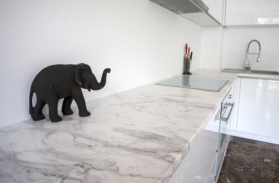Mit einer Arbeitsplatte aus weißem Marmor wirkt Ihre Küche optisch größer. Wenn Möbelfarbtöne besser zu einem braunen Farbton passen, sollten Sie eine braune Arbeitsplatte haben. Unabhängig vom gewählten Farbton vermittelt der polierte Marmorglanz das Gefühl von Größe, da er wie ein Spiegel funktioniert.