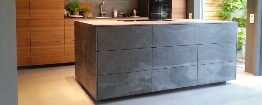 Preparing meals will be much easier, giving you a comfortable space. You will have everything at hand – you can embed the sink or the stove top or you can also integrate shelves or storage facilities – and you can arrange it so that there is a dining place, by adding some chairs and lighting objects, targeting the island. Based on the design of your kitchen, you can use this island for a color touch and texture, as an instant eye catcher. A matching countertop for this project can be made from natural stone – marble – or you can clad it with SKIN Flexible Slate, if produced from another material.