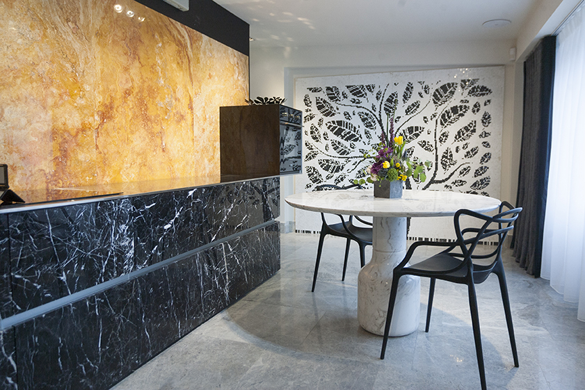 If you still want something even more spectacular compared to flexible natural stone, a particular texture or an even more elegant material, you can decide to clad your furniture with marble. So, we experimented in our showroom (Aleea Teisani 137A, Bucharest) and re-created a full-scale apartment. For kitchen, we selected a very popular material – Nero Marquina marble – used it for furniture cladding. With peach travertine backsplash, we have attained a spectacular contrast, also available for your home – two materials with strong personalities, yet together durable. This project of furniture cladding with Nero Marquina Marble was a joint-venture with Romanian Furniture Club Association (ACRM). PIATRAONLINE portfolio includes plenty of natural stone for your kitchen decoration project.