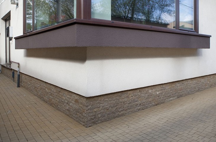 Auch mit Splitface-Finish bewahrt Sunny Dream Marmor eine besondere Eleganz: dunkelbraune Flächen auf hellcremefarbenem Untergrund verleihen Ihrem Dekorationsprojekt einen besonderen Charme. Das Bild zeigt den mit Sunny Dream Spitface Marble 7x30 cm verkleideten Sockel des Hauses. Der Vorteil dieses Marmors ist die Imprägnierung, wodurch die Haltbarkeit erhöht wird, wenn er mit LTP Mattstone, einem professionellen Versiegeler, versiegelt wird.