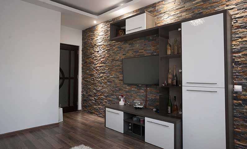 Eine mit Naturstein verkleidete Wand ist eine Ecke der Natur in Ihrem Zuhause, mit der Fähigkeit, das Ambiente Ihres gesamten Raums zu verändern. So werden Sie sich jeden Tag in einem solchen Raum wie eine Umarmung der Natur direkt in Ihrem Zuhause fühlen.