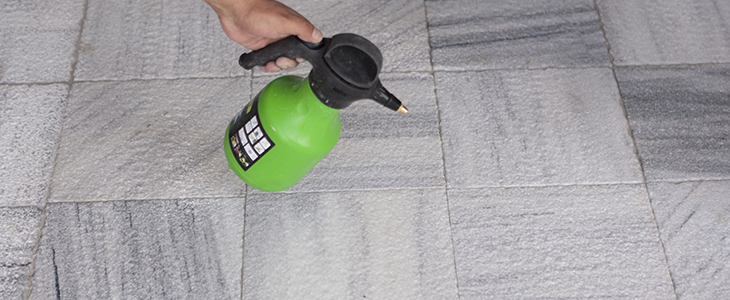 Verwenden Sie einen Wasserstrahl, um Staub zu entfernen, der nach dem Kehren zurückbleibt, und um hartnäckige Flecken einzuweichen. Entfernen Sie ölige Flecken, auch die vom Grill, mit Hilfe von zwei LTP-Lösungen: Fullers Earth und Spot Stain Remover. Diese Substanzen sollten zusammen verwendet werden. Tragen Sie zuerst die flüssige Lösung auf und lassen Sie sie einige Minuten einwirken, damit sie in den Stein eindringt. Tragen Sie dann das Pulver auf, das den Fleck extrahiert.