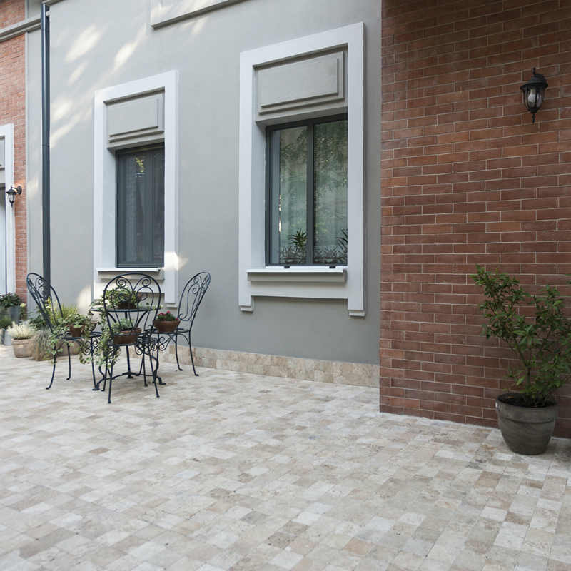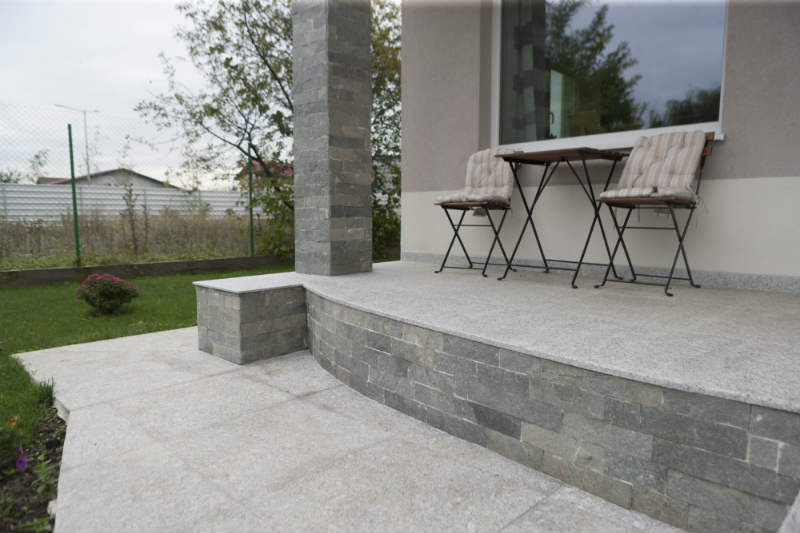 Aufgrund der breiten Farbpalette ist es einfacher, sich mit jeder Art von Naturstein zu assoziieren, sei es durch komplementäre Beziehungen (enge Farbtöne) oder durch Kontraste (unterschiedliche Farben). Die gesamte Außenatmosphäre des Hauses wird durch den Mix aus Zierputz und mit Naturstein verkleideten Flächen geschaffen: Gurte, Stützpfeiler, Terrasse, Laufstege, Fensterzierumrahmungen, Fensterbänke etc.