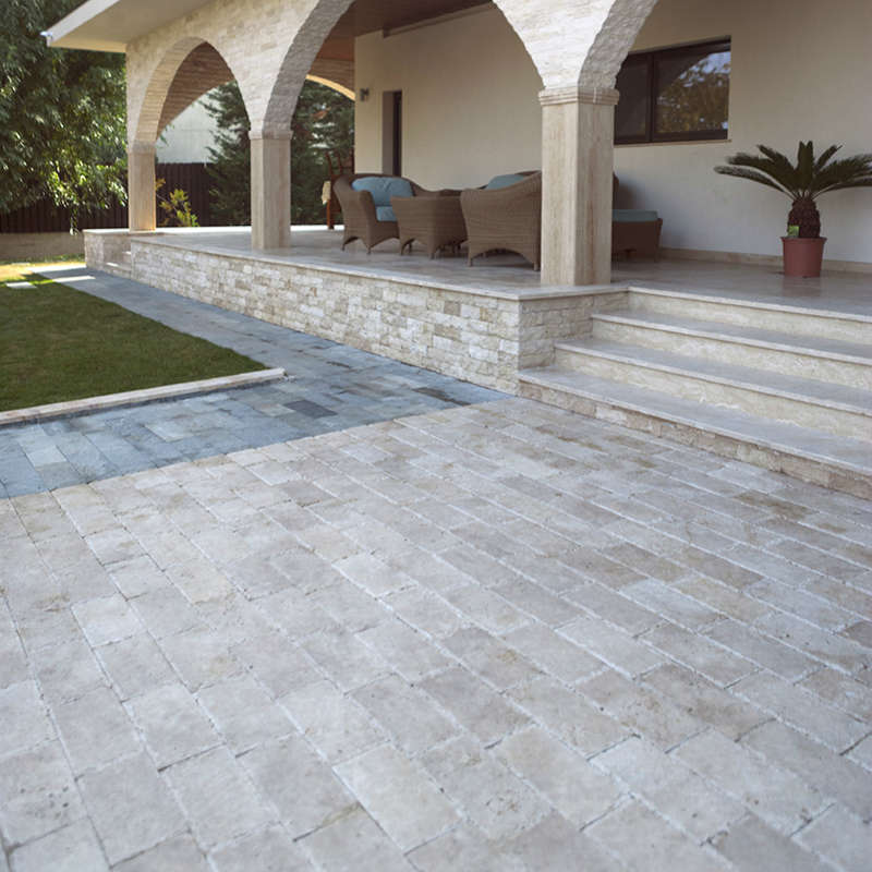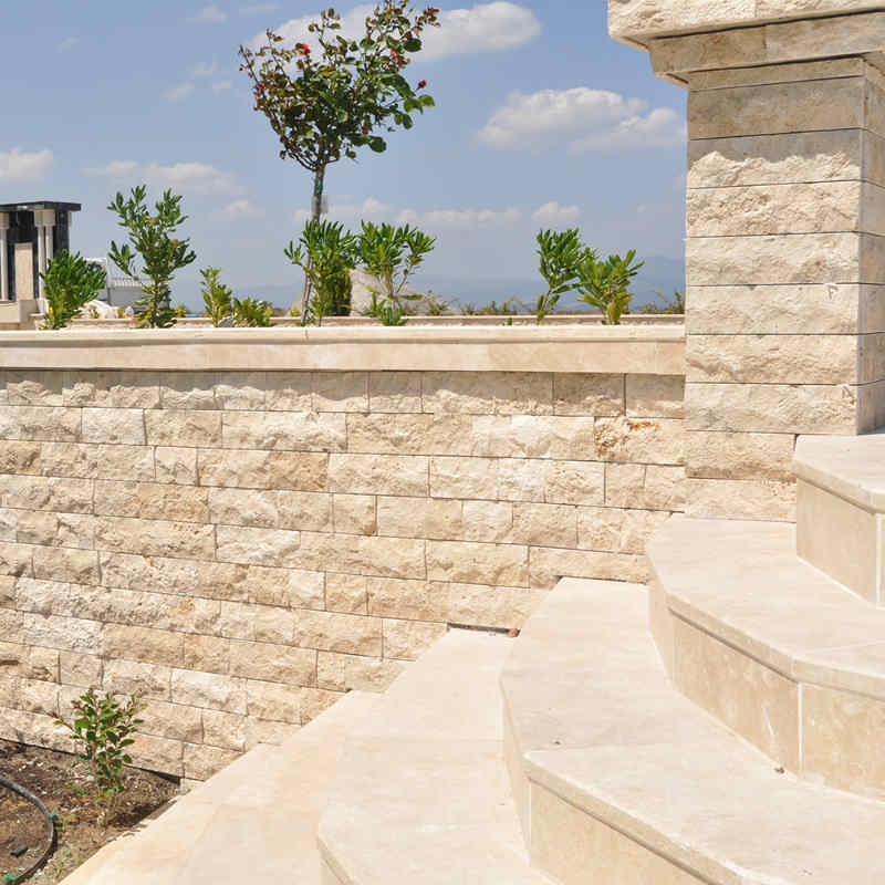 Stein für Außenverkleidungen hat noch einen weiteren Vorteil: eine große Auswahl an Farben und Texturen. Wir sprechen hier von Weiß, Schwarz, Cremetönen, Braun, Grau, Grün Rost etc. Mit der ganzen Palette an Oberflächen lassen sich verschiedene Steine leichter kombinieren. Für einen Terrassenboden mit gebürstetem und gemeißeltem Travertin können wir ihn mit Splitface-Travertin der gleichen Farbe kombinieren, den wir auch für die Verkleidung von Pfosten und den Sockel des Hauses verwenden werden.