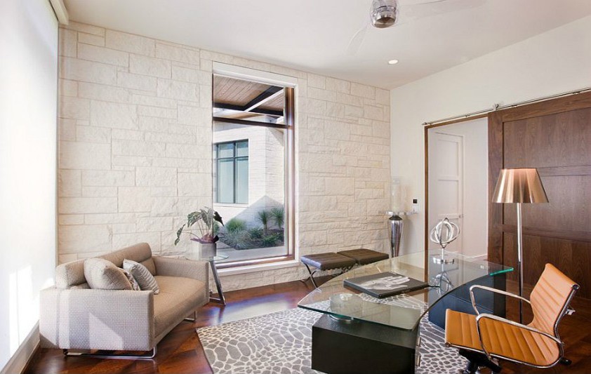 In dieser Situation spielt die Farbvariation die grundlegende Rolle. Die cremige Farbe des Steins bildet den Übergang zwischen den weißen Wänden und dem Braun des Bodens und der Möbel. Die Kalksteinmauer bricht scheinbar die Harmonie, tatsächlich ist sie es aber gerade, die sie erreicht.