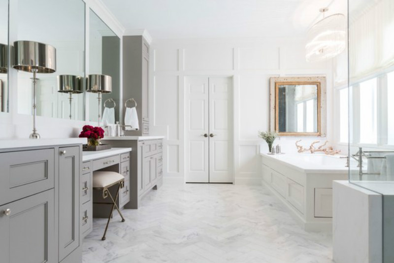 In Beispiel A ist die größte Änderung die Helligkeit des Raums. Von dort kommt die Spannung und die stimmungsvolle Atmosphäre vor dem Dekorationsprojekt. Wenn wir die Geometrie des Raums hinzufügen, der auf die rechte Seite des Raums geschoben wird, wo die Linien das Gleichgewicht brechen, erkennen wir, dass eine Änderung erforderlich ist. „Danach“ entdecken wir ein weiteres Badezimmer, hell, entspannend, ohne geometrische Auffälligkeiten. Arbeitsplatten aus weißem Marmor fügen sich perfekt in die Umgebung ein. Das Grau der Möbel und der Glühbirnen harmoniert genau wie es sollte mit dem dominierenden Weiß.