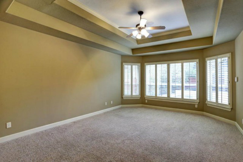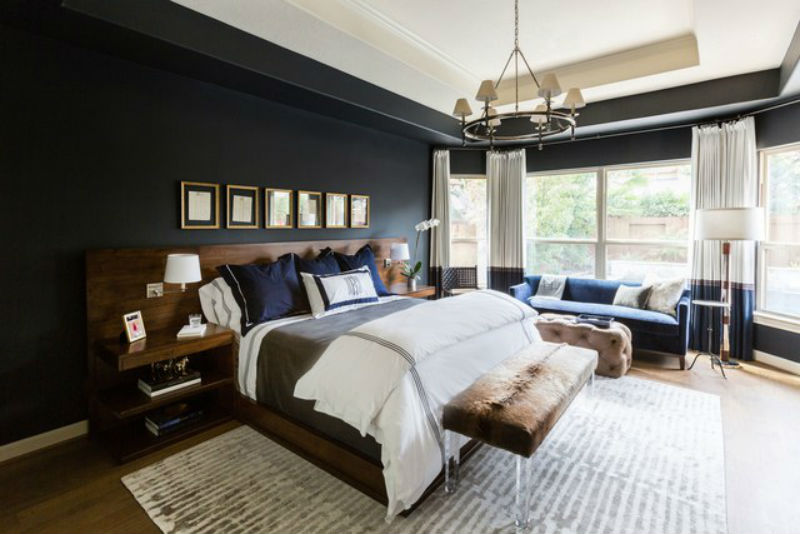 Für das Dekorationsprojekt in diesem Beispiel überspringen wir den offensichtlichen Nachteil der cremefarbenen uninspirierten Aufhängung an der Decke und bleiben bei der gewagten Lösung der gestrichenen Wand in Dunkelblau stehen. Eine einfarbige Wand, eventuell mit Naturstein verkleidet, wie wir in diesem Blog geschrieben haben, erzeugt das Gefühl von Räumlichkeit. Die Wand hinter dem Kopfteil dominiert mit der weißen Decke gleichermaßen das Schlafzimmer. Der Kontrast ist stark, aber entspannend. Wenn „vorher“ wie eine Kiste mit einem Stück Weiß an der Decke „zerdrückt“ war, ist das Weiß nach der Renovierung noch größer und erhellt den Raum.
