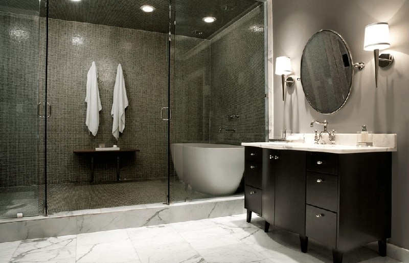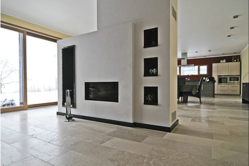 Wenn es keinen Zweifel an der Praktikabilität des Sockels gibt, werden wir zunächst auf der ästhetischen Funktion des Sockels bestehen und am Ende den Aspekt der Unterschiede zwischen den Materialien behandeln, wie z. B. die Sandsteinfliese im Vergleich zu Marmor oder Travertin. Anscheinend ist der Sockel nur ein Streifen, dessen Farbe zum Rest des Raums passen muss, aber die Art und Weise, wie er mit dem Ensemble interagiert, ist viel komplexer, wie wir sehen werden.
