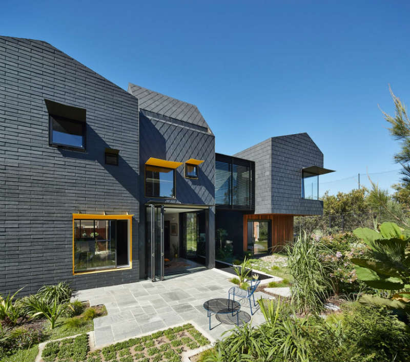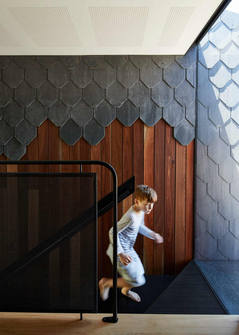 Schiefer kann auch in Fliesen integriert werden, ein Weg einer verspielteren ästhetischen Kunst, wie in diesem Haus in Melbourne, das vom Architekturbüro Austin Maynard entworfen wurde. Die Verschmelzung setzt sich im Inneren des Hauses fort, was besonders in Durchgangsräumen oder an Orten wie offenen und geschlossenen Gewächshäusern oder Terrassen eine Einheit schafft.