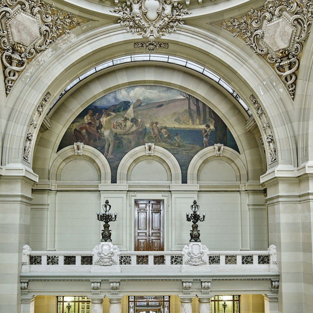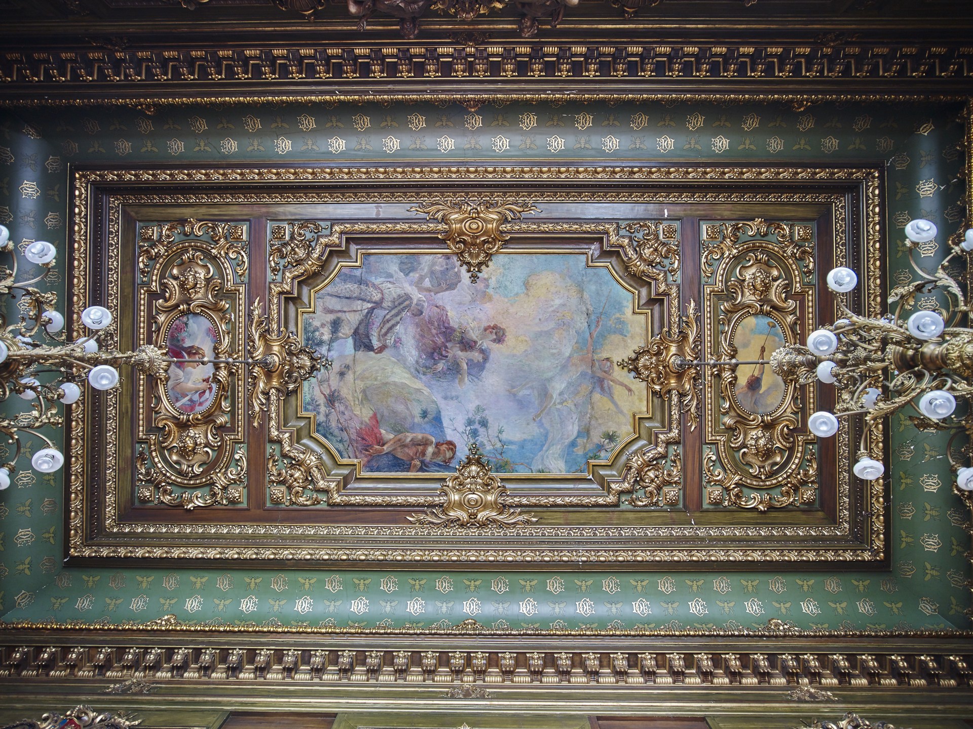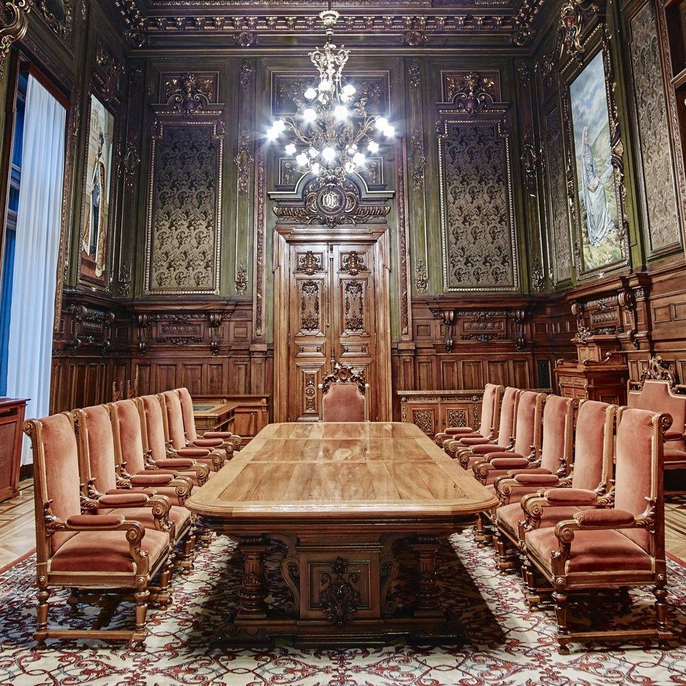It was also imagined by architect Paul Gottereau – the large lobby was decorated with a mural painting depicting the Goddess Fortuna distributing goods after the independence, the work of Mihail Simonidi. He is also responsible for ceiling painting in the festive hall upstairs. Until the year 1948, the side walls featured portraits of King Carol I and Queen Elizabeth – also painted by Mihail Simonidi, besides portraits of King Ferdinand I and Queen Maria – painted by Costin Petrescu. As soon as Communist Party assumed power, the portraits were covered with paint, only to be subsequently recreated by the contemporary plastic artist Valentin Tanase, after a meticulous work of documenting and research. Perhaps the most imposing room of the palace is the “Council Hall”, still in use these days, with the same purpose.