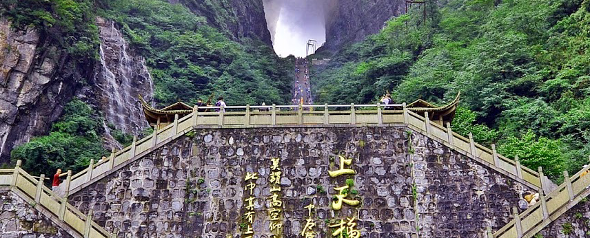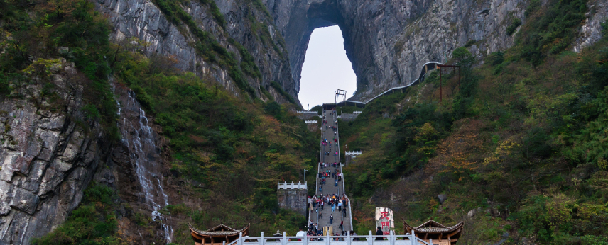 Legenden zufolge markiert das Jahr 263 den Einsturz eines großen Bergstücks, wodurch eine riesige Höhle entstand – 131,5 m hoch, 57 m breit und 60 m lang –, die dieses Tor geschaffen hat, das aus biblischen Szenen zu stammen scheint. Auf der Spitze des Berges und am Ende der Treppe befindet sich ein religiöser Schrein, der Tianmenshan-Tempel , der über 999 Stufen aus Naturstein erreichbar ist. Der Tianmenshan-Tempel wurde 870 erbaut und gilt als das buddhistische Zentrum des westlichen Hunan.