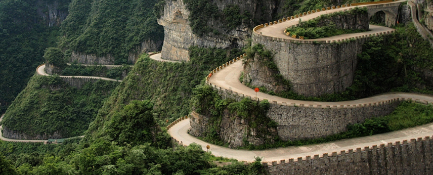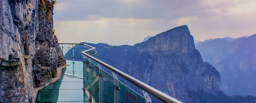 Das Himmelstor vom Tianmen-Gebirge ist eines der beliebtesten Touristenziele in China. Abgesehen von den 999 Steintreppen, die Sie erschrecken könnten, erstrecken sich die 99 Serpentinen über eine Länge von 11 km und könnten angeblich zum Leben erweckt werden, indem sie die Form eines weißen Drachen annehmen. Der wahrscheinlich adrenalingeladenste Pfad ist The Coiling Dragon Cliff , der aus Glas besteht und sich mit einer Länge von 100 m und einer Breite von ungefähr 1,6 m entlang des Berges erstreckt.
