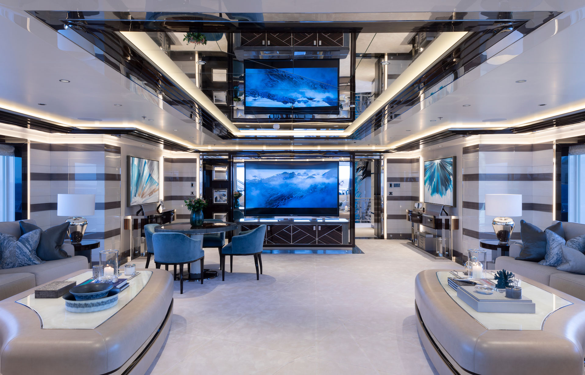 Für den Innenraum fertigte der berühmte Glasbildhauer Dale Chihuly einige echte Kunstwerke an, um die türkisfarbene Marke als Botschaft sanft hervorzuheben. Ein zusätzliches Superior-Deck, das für den Eigentümer und seine Familie konzipiert wurde, wurde mit einem Swimmingpool mit Wasserfall in der Mitte individuell gestaltet. Seine breiten Fenster, die eine weite Perspektive bieten, neben prächtigen Innenräumen, Faltwänden mit Meerblick und einem Hubschrauberlandeplatz am Bug sind spezifische Elemente, die das Projekt weiter individualisieren.
