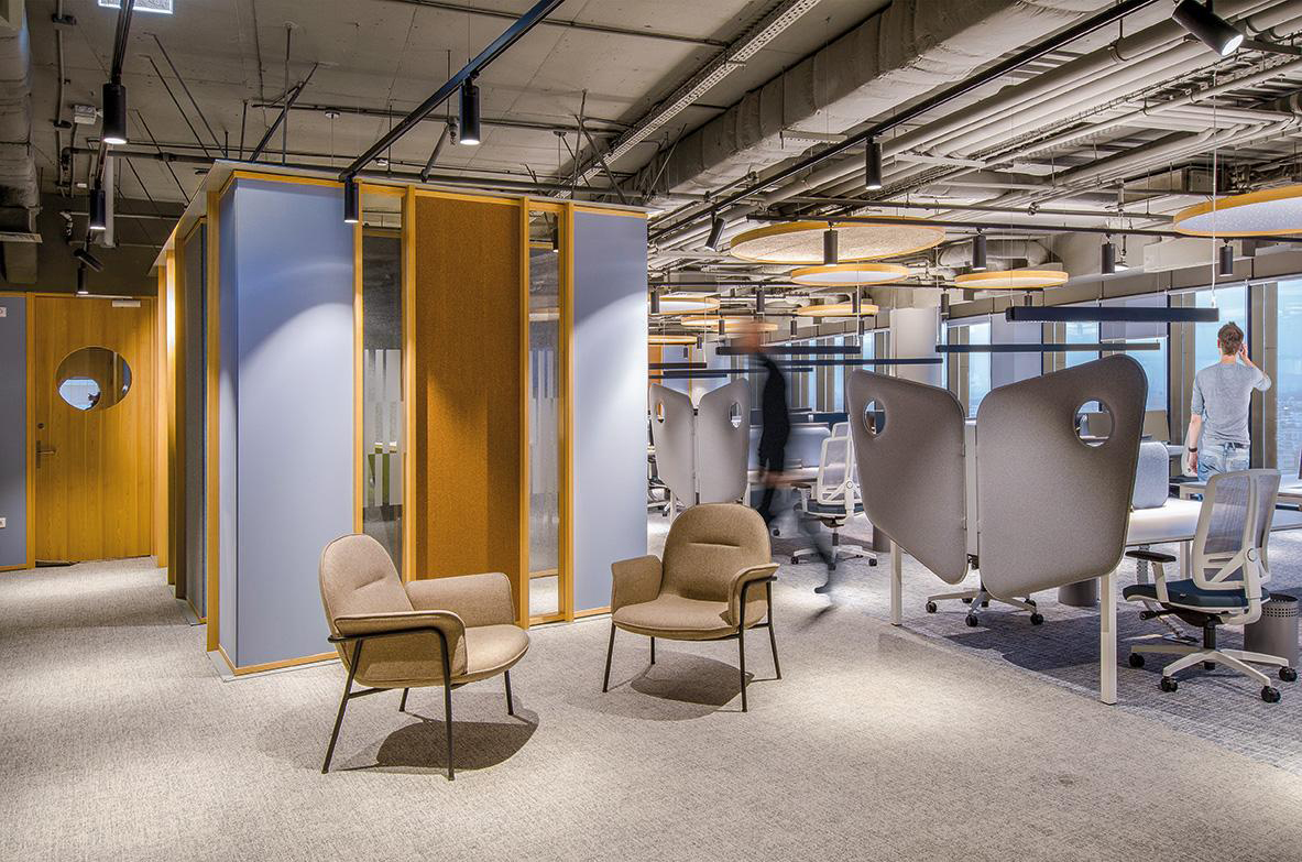 Microsoft-Büros zeichnen sich durch ein schlichtes und ehrliches Design aus, das einen neutralen Hintergrund unterstreicht. Es wurden natürliche Materialien wie Filz, Sperrholz und Kork verwendet. Ein solches Design weist einige Materialien auf, die so natürlich wie möglich sind. Holz fügt sich beispielsweise harmonisch in Glasleisten ein. Es wurden schallabsorbierende Paneele verwendet, eine Möglichkeit, die funktionalen und ästhetischen Bereiche zu kombinieren. Die für dieses Projekt ausgewählten Möbel sind nicht überladen und harmonieren perfekt mit der Umgebung.