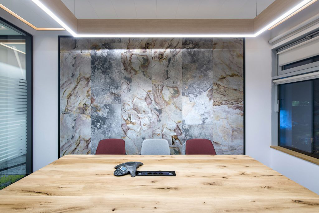 Stone Hall ist mit SKIN Flexible Slate dekoriert. Solch ein dünnstes Produkt – „Natursteintapete“ – wurde durch Spalten der Schieferblöcke erhalten. Das Ergebnis ist ein spektakuläres, einzigartiges Texturprodukt, denn jeder Streifen ist einzigartig. Sie werden keine zwei identischen Produkte finden und zusammen haben Sie ein echtes sensorisches Erlebnis.