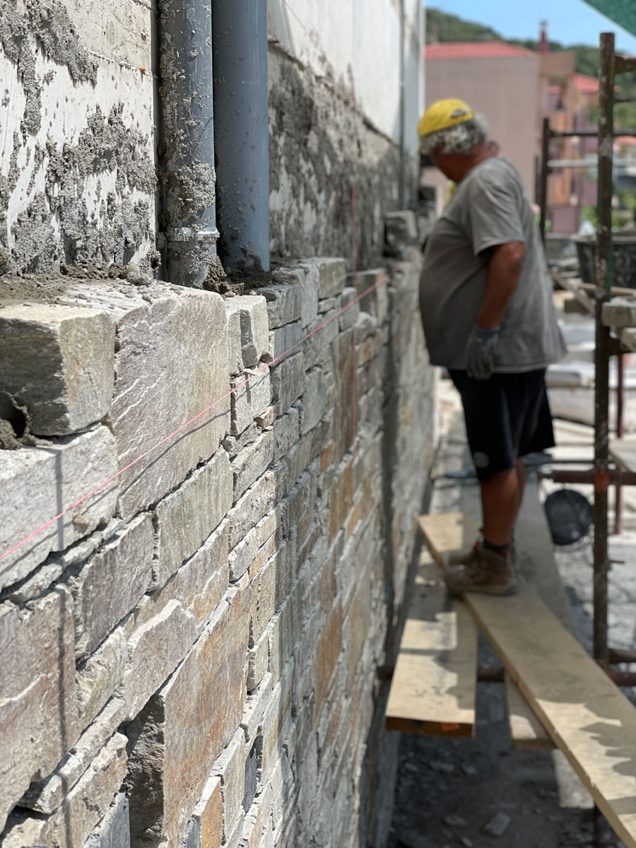 Nach der Vorbereitung der Unterlage ist die Auswahl der Steine aufgrund ihrer unregelmäßigen Form besonders bei polygonalen Steinen unerlässlich. Nach dem Befestigen des ersten Steins, normalerweise in einer Ecke am Boden der Platte, wird ein zweiter ausgewählt. Es muss so angepasst und montiert werden, dass es einem einheitlichen Design folgt und die großen Zwischenräume zwischen Felselementen vermeidet. Wenn die Steinelemente nicht perfekt passen, müssen sie angepasst werden. Der Vorgang wird von Hand mit Winkelschleifer und Hammer durchgeführt. Aufgrund dieses Details können Sie täglich 2 m² verlegt nicht überschreiten. Überprüfen Sie nach dem Verlegen der Fliesen immer die Ebenheit. Dekorationsprojekte, die Rock Face Flat/Filleti Slate verwenden, können mit bis zu 3-4 m²/Tag verlegt werden. Verwenden Sie zum Verfugen klassische Fugenmörtel auf Zementbasis. Unabhängig vom Projekt erfordert die Verlegung mediterraner Steine Fachwissen und Kreativität. Solch ein echter Look wird mit harter Arbeit erreicht und die Kundenzufriedenheit auch.