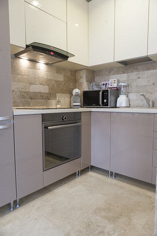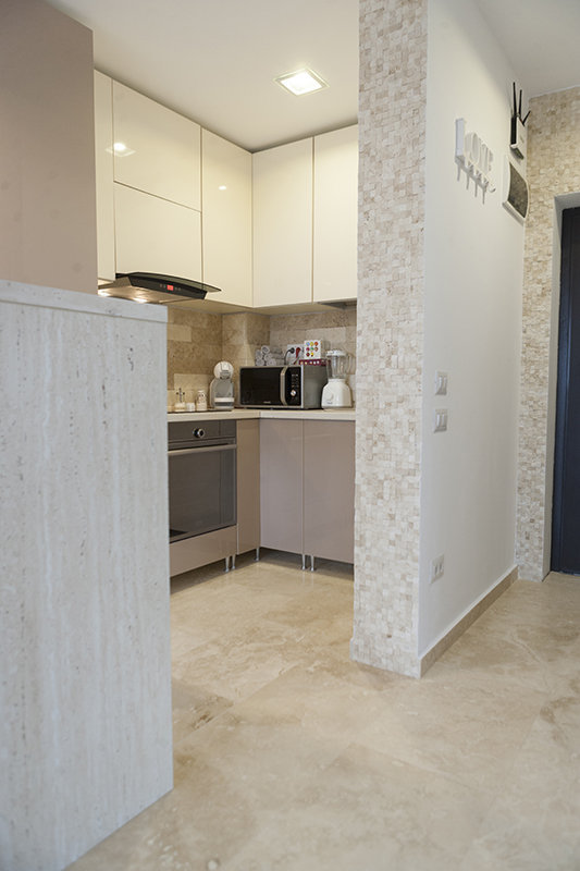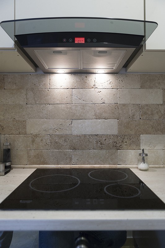 Sie verkleideten die Küchenwand mit Classic Tumbled Travertine Mosaic , wobei der Boden beider Räume (Küche und Wohnzimmer) mit dem gleichen Classic Cross Cut Honed Travertine verkleidet war. Das Dekorationsprojekt wurde auf ungefähr zwei Wochen verlängert, wobei ein exklusives Installationsteam schnell und gut arbeitete.
