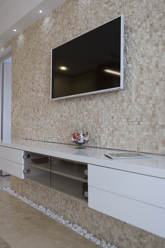 „Wir haben uns von unserer Fantasie inspirieren lassen, da wir uns unsere mit Naturstein dekorierte Wohnung bereits vorgestellt hatten, als diese bereits leer war. Das Mosaik von der Wohnzimmerwand – Classic Travertine Splitface 3D Mosaic – war für Silviu Liebe auf den ersten Blick. Mir hat es auch sehr gut gefallen, daher habe ich seine Intuition sehr geschätzt", erläutert Diana für den PIATRAONLINE-Blog.