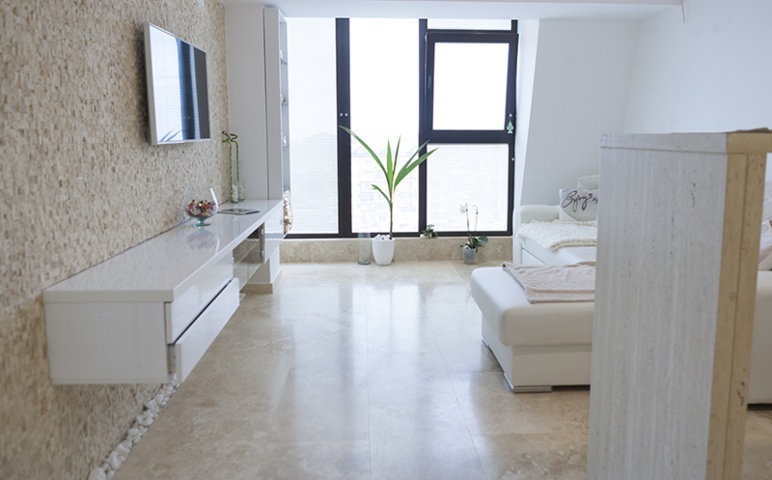 Diana und Silviu verliebten sich in Naturstein, als ihnen bei einem Besuch bei einem ihrer Freunde die Travertin-Dekoration auffiel. Ihre Zweizimmerwohnung befindet sich in der obersten Etage eines Gebäudes im Chiajna-Viertel (SW Bukarest). Dachgeschosswohnung plus ein beeindruckendes Panorama, es hatte von Anfang an das Potential ihres Traumhauses. Der nächste Schritt war das Dekorationsprojekt, eine Aufgabe, die von beiden übernommen wurde, um einen freundlichen, warmen und geräumigen Raum zu schaffen.