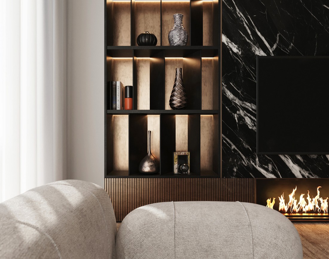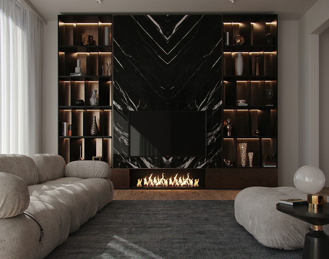 Wir möchten ein wenig über das Projekt Modern Living Room sprechen, bei dem wir gesehen haben, dass Sie mehrere Kombinationen von Texturen verwendet haben, darunter Holz, natürliche Stoffe und Naturstein, genauer gesagt schwarzer Marmor. Warum haben Sie sich für diese Kombinationen entschieden und welches Ergebnis wollten Sie erreichen?