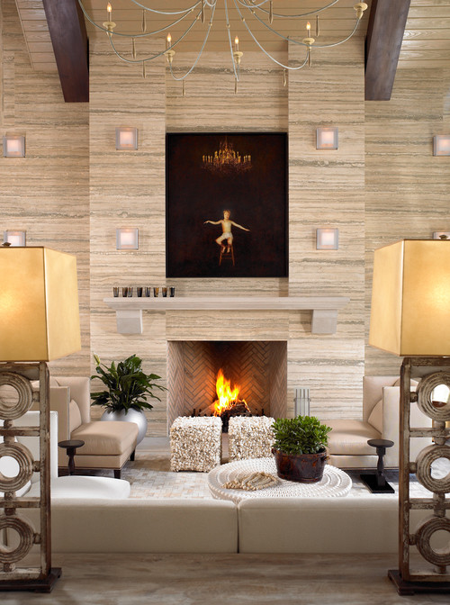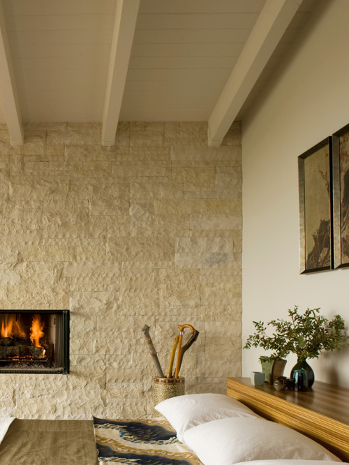 Dann, im Wohn- oder Schlafzimmer, schafft eine Travertinwand eine natürliche, starke und entspannende Note. Die Beigetöne des Steins in Kombination mit Holzmöbeln und Dekorationen aus Naturfasern vermitteln eine ruhige Eleganz, ähnlich wie auf dem Bild. Interessant ist auch die Idee eines wandintegrierten Kamins.