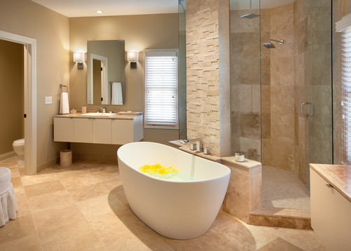 Die Verkleidung Ihrer Badezimmerwand mit Travertin-Splitface-Mosaik schafft ein Zen-Ambiente – das Bild unten zeigt einige einfache, symmetrische Linien, die durch die raue Steinstruktur ergänzt werden, während die Spiegel das Licht stark reflektieren, ein Effekt, der die Schönheit des Steins unterstreicht.