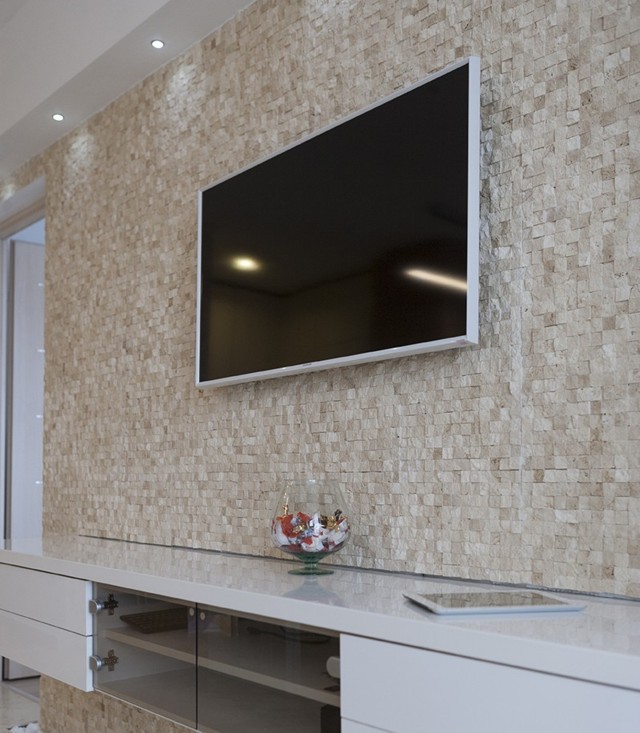 Wohnzimmerwand verkleidet mit klassischem Travertin Splitface 3D-Mosaik
