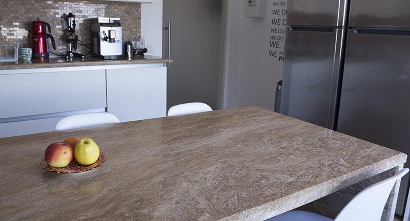 Mit Travertin verkleidete Küchenwand