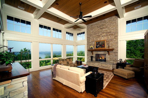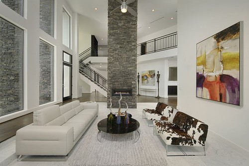 Wenn Sie ein geräumiges Wohnzimmer mit großen Fenstern haben, in denen das Licht den Raum durchflutet, verkleiden Sie die gegenüberliegende Wand mit Naturstein. So erzielen Sie einen wahren Betäubungseffekt. Das am besten geeignete Material für Fußböden ist auch Naturstein, nämlich Marmor oder Travertin.