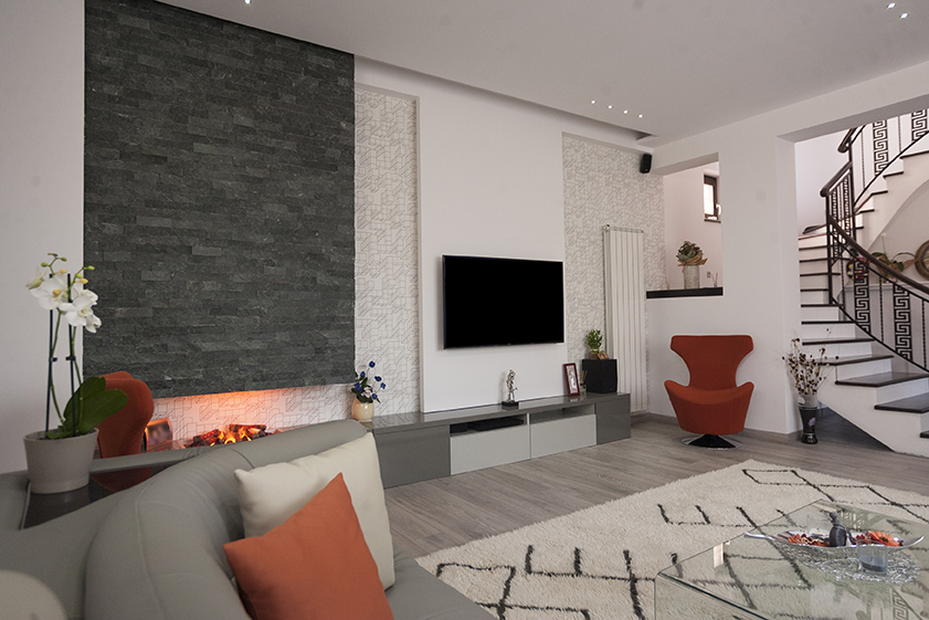 Die gleiche erstaunliche Eigenschaft wird auch durch einige Marmormodelle unterstrichen, wie zum Beispiel Arabescato Polished Marmor, mit bemerkenswerten Effekten und der vollen Ausnutzung der Natursteineigenschaften. Ein weiteres Merkmal, das häufig in Dekorationsprojekten verwendet wird, ist die natürliche Spaltneigung von Schiefer. Daher basiert die Entwicklung von flexiblem Schiefer auf dieser natürlichen Spaltneigung, um ein Material zu schaffen, das die Verkleidung von gekrümmten Oberflächen oder Wänden ermöglicht, die keine großen Gewichte tragen können (wie Gipskarton, Trockenbau usw.). Wohnzimmer-Designtrends mit flexiblem Schiefer sind 2019 innovativ. Die Verkleidungen aus flexiblem Schiefer Skin Forest sind elegant und überraschend in Farbe und Textur, und die mit dem flexiblen Schiefer Skin Autumn Rustic beinhalten eine Mischung aus Moderne und Echtheit mit authentischen Merkmalen.