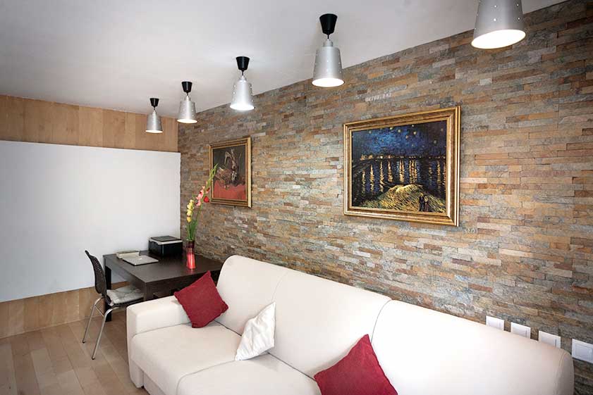 Stellen Sie sich eine Wand in Ihrem Schlafzimmer vor, die mit Splitface-Verkleidung dekoriert ist. Naturstein ist in einer Vielzahl von Farben erhältlich, sodass Sie die für Ihren Raum am besten geeignete finden können – braun, beige, grün usw. Splitface-Verkleidungen werden so hergestellt, dass sie wie überlappende, ungleichmäßige Fliesen aussehen. Ein solches Design vermittelt rustikales Ambiente für vollkommene Entspannung. Diese Wände können für einen modernen und minimalistischen Stil oder vielleicht konversatorisch und komplex angepasst werden. Sie können sogar ein unkonventionelles Schlafzimmerdesign mit pastellfarbener Verkleidung haben.