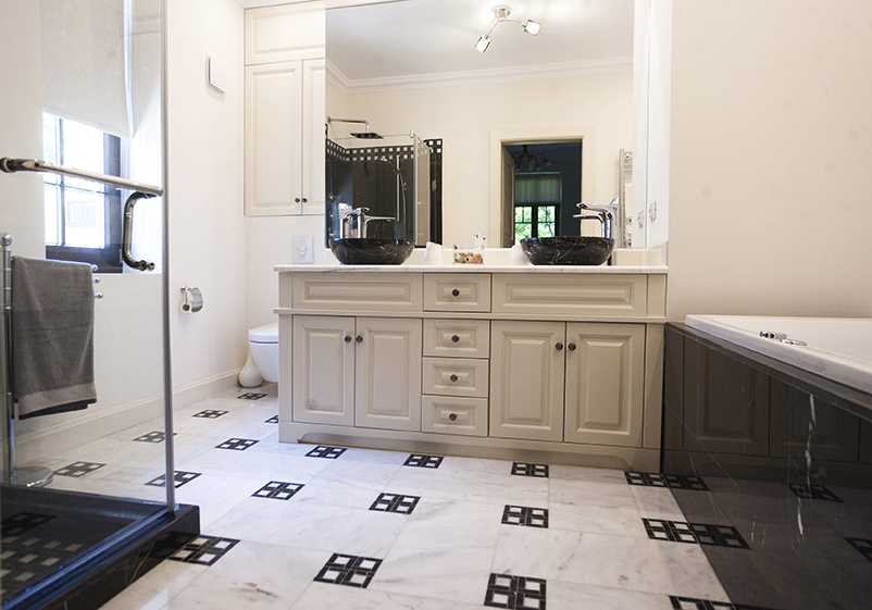 Heutzutage gibt es mehrere künstliche Materialien, die wie Naturstein aussehen. Die Vielseitigkeit von Naturstein lässt sich jedoch auch mit einem minimalistischen Design kombinieren. Sie können ein schwarzes Waschbecken und Accessoires wie Seifenschale und Becher für Zahnpasta und Zahnbürste sowie kleine Aufbewahrungsschalen aus weißem Marmor wählen. Kombinieren Sie sie mit schwarzen Marmorhaken mittlerer / großer Größe und Sie erhalten ein natürliches Ambiente in einem höchst unerwarteten Raum.