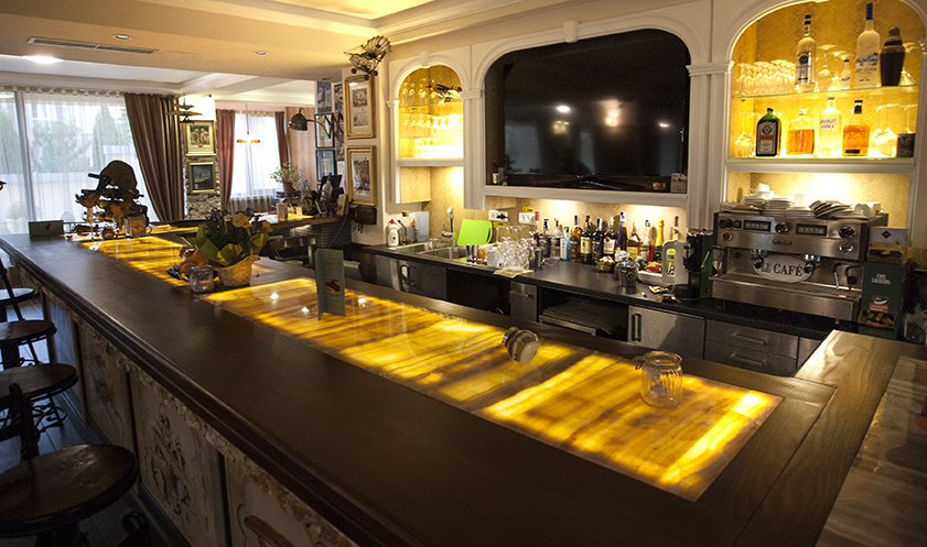 Die Tatsache, dass beide durchscheinend sind, ist das gemeinsame Merkmal von Marmor und Onyx, dieser Zauber des Lichts, das sich auf beiden Steinen zerstreut, unter den Sonnenstrahlen, die über die Verkleidungen projiziert werden. Wenn heller transluzenter Marmor eine geschliffene, subtile und ausgewogene Sonne vermittelt, verleiht Onyx dem Licht eine kunstvolle und vornehme Atmosphäre ( transluzenter Onyx ). Marmor- und Onyxmosaike sind nicht lichtdurchlässig. Je nach Vorliebe können auch Oberflächen mit interessanten Ergebnissen beleuchtet werden. Wenn Sie die durchscheinende Eigenschaft von Marmor und Onyx hervorheben möchten, müssen Sie für die Installation weißen Fugenmörtel verwenden. Beide Effekte messen ihre Effizienz an der Emotionalität, die beim Kunden erzeugt wird.