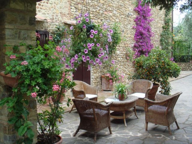 Von den Farben, die für den Steinboden (Travertin ist beliebt) ausgewählt wurden, vorzugsweise warm, mit einem Hauch von Gelb, Orange, Rot (niemals Grau) für Möbel – die äußerst bequem sein müssen, oder Pflanzen – gefärbt, was dem einen dramatischen Look verleiht Terrasse oder Garten. Das toskanisch inspirierte Design verwendet dunkles Holz und Naturstein, verbunden mit Eleganz im alten Stil.