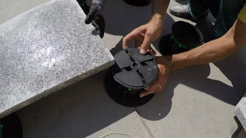Das „Geheimnis“ besteht aus einigen Kunststoff-Abstandshaltern (Polypropylen), die sehr widerstandsfähig, aber sehr leicht sind und als verstellbare Plattenlager bezeichnet werden. Sie können ihre Höhe und ihren Winkel zum Boden ganz einfach so einstellen, dass der Boden eben ist. Diese verstellbaren Plattenlager können bis zu einer Höhe von 45 cm reichen. Die Höhenverstellung erfolgt über ein Gewindesystem: Einige große Muttern, ebenfalls aus grünem Kunststoff, leicht zu drehen, ermöglichen das Anheben der Segmente im gewünschten Abstand. Sehr einfach.