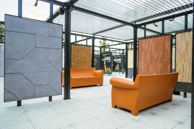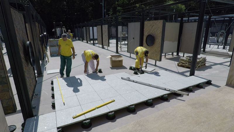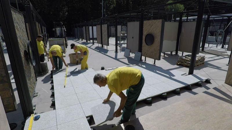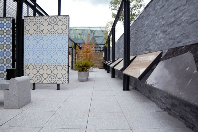 Eines der ersten Dinge, die den Besuchern des PIATRAONLINE-Pavillons auffielen, war der Boden. Anstelle des alten Betons wurden sie von einem Boden empfangen, der vollständig aus 3 cm dicken Granitfliesen bestand, die perfekt auf der gleichen Ebene ausgerichtet waren, als wären sie gegossen. Ein einziger Hinweis lässt Sie diese Theorie des Gussmaterials ablehnen: die leeren Räume zwischen den Platten. Für viele war es ein Rätsel, dass der Boden in unserem Pavillon perfekt eben war.