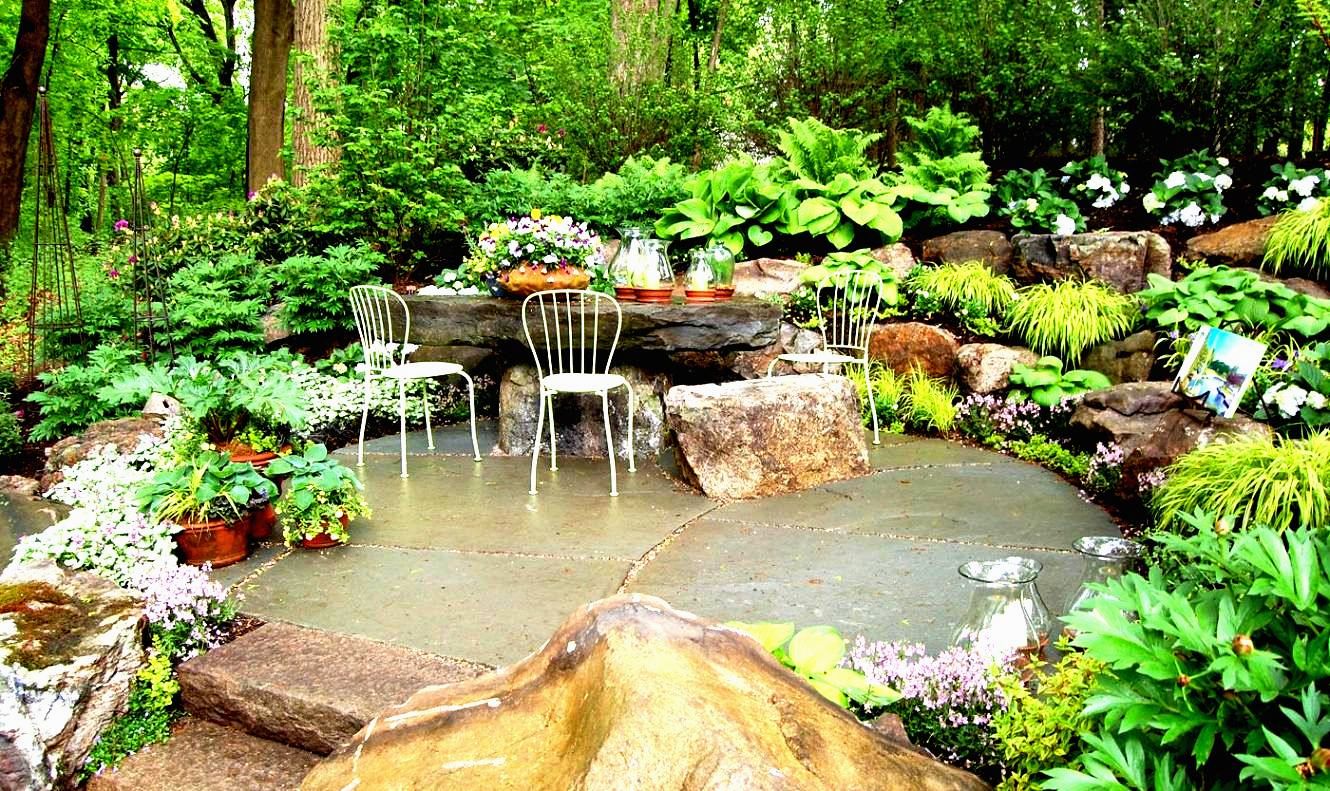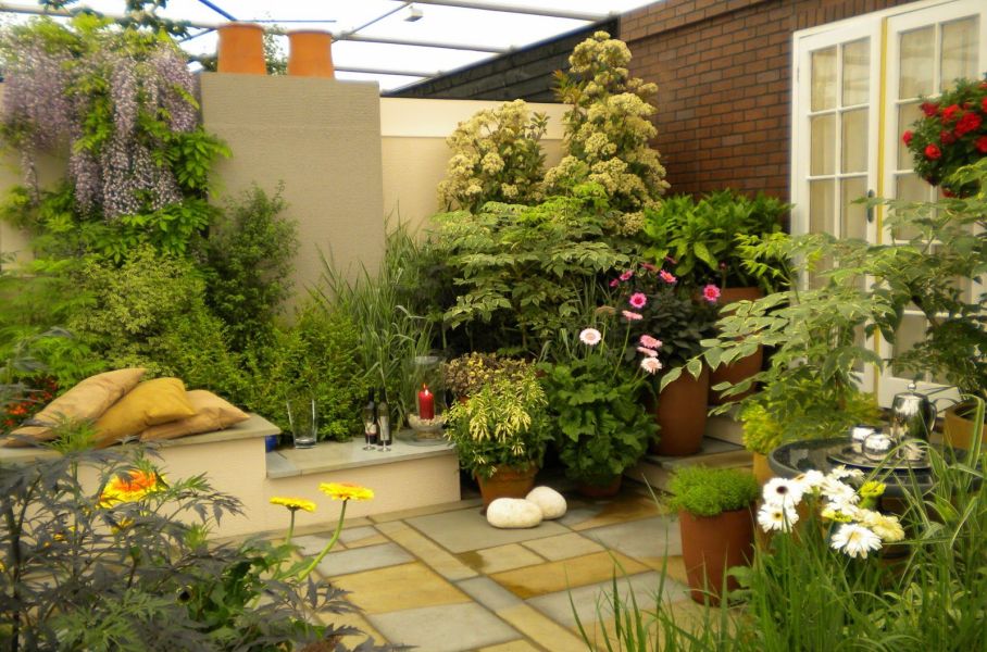 1. Dekoration und Funktionalität mit einem einzigen Artikel für kleine Gärten, mit geeigneten Farben und so positioniert, dass er das Gefühl eines Raums vermittelt, der größer ist, als er tatsächlich ist. Gesammelte Pflanzen in Containern, die vor Ort aus Naturstein hergestellt wurden, Steinstandorte mit multifunktionalen Zielen.