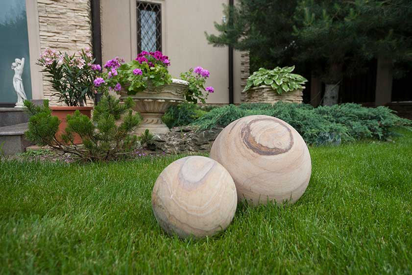 Sie können beispielsweise Sandsteinsäulen zur Vervollständigung Ihres Entwurfs hinzufügen. Fügen Sie außerdem dekorative Regenbogen-Sandsteinkugeln hinzu, wahre Symbole für Perfektion und Raffinesse. In Bezug auf Naturstein verblüfft Sandstein mit seinen warmen Beigetönen, ähnlich der Farbe von Sanddünen aus Wüsten, sowie seinen rostigen kreisförmigen Einsätzen. Sowohl Säulen als auch dekorative Kugeln aus Regenbogensandstein passen zur klassischen und traditionellen Landschaftsgestaltung.