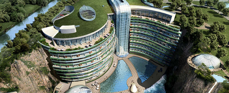 Das InterContinental Shimao Wonderland ist das einzige Hotel der Welt, das in einem verlassenen Steinbruch gebaut wurde. Der Boden des Steinbruchs wird mit Wasser gefüllt, sodass 2 der 19 Stockwerke dieses beeindruckenden Gebäudes praktisch unter Wasser stehen werden. Und diese außergewöhnliche Idee eines 5-Sterne-Wolkenkratzers, der tief in die Erde gebaut wurde, wäre nicht möglich gewesen, ohne dass sich Architekten auf die Widerstandsfähigkeit und Langlebigkeit von Naturstein verlassen konnten.