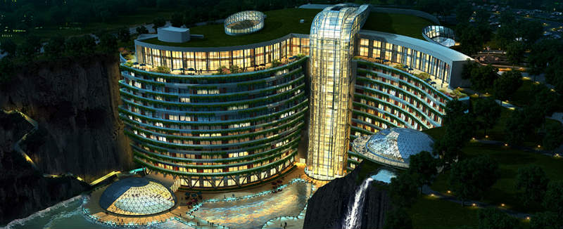 Die perfekten Wasserfälle zum Bungee-Jumping, Wälder auf den Dächern, ein künstlicher See zum Üben des Bootsfahrens, Restaurants in den ersten 2 Etagen (dh unter Wasser), Spas, Gewerbegebiete, Clubs, Wandermöglichkeiten, ein Aquarium in 10 m Tiefe Wasserspiegel, Swimmingpool, die neuesten Bautechnologien und die besten Eigenschaften aus der Hotellerie, all dies beschreibt dieses erstaunliche Hotel, vielleicht einzigartig dank seiner perfekten Methode, sich in die Natur einzufügen.