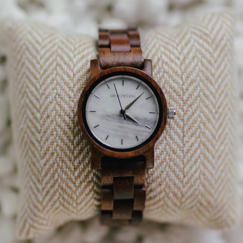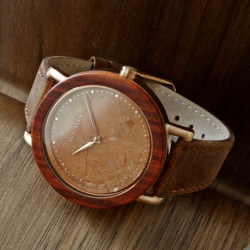 Holkern versucht, das Design in zwei Teile zu gliedern: Lünette und Armband – einerseits das Marmorzifferblatt – andererseits. Sobald Grenzen gesetzt sind, heben sich Marmor und Holz gegenseitig hervor und man kann die wahre Schwingung von Naturmaterial im Vergleich zu Kunststoff kaum wahrnehmen. In Bezug auf Kunststoff und Naturmaterial müssen wir eine benötigte Halterung herstellen: Der Preis für solche Uhren beginnt bei 150 US-Dollar. Und er erreicht einige Tausend: LU Chopard. Die Schöpfer von LU Chopard wählten den Schiefer für das Zifferblatt. Die super stylischen Linien der Marke wirken mit Schiefer noch eindrucksvoller. In diesem Fall zeigt der Stein seinen vielseitigen Charakter, er bleibt stilvoll, aber mit einem Hauch von Dynamik.