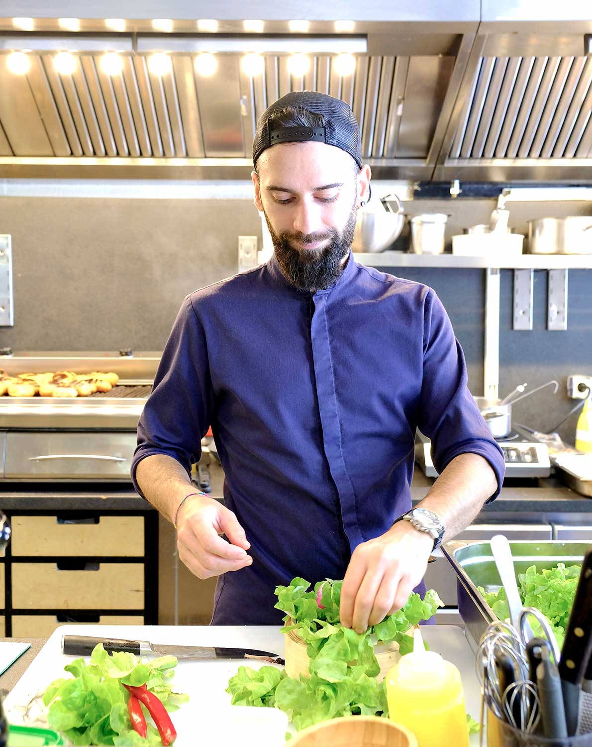 In einem Raum, in dem die Natur ihr Rohmaterial auf den Tischen zeigt, wird Stein durch Arbeitsplatten repräsentiert – Tundra Grey-Marmor mit polierter Oberfläche ist das Material. Ein subtiler Hauch von Eleganz – paradox für Fischer – und die Adern, die die Marmoroberfläche durchziehen und Eleganz vermitteln. Der Stein wird auch zum Überziehen von Sushi verwendet – ein erstaunlicher Nero-Schiefer mit einer so subtilen Eleganz, die sich unter der schwarzen, geschliffenen Farbe verbirgt. Dies ist ein Stein mit exotischem Touch , der aus Brasilien importiert und abgebaut wird, ideal zum Plattieren von warmen oder kalten Gerichten und somit zur Kunst der Gastronomie. Dies ist auch eine originelle Möglichkeit, sich von anderen Räumen mit Standardbeschichtung abzuheben.