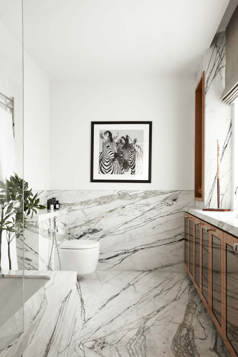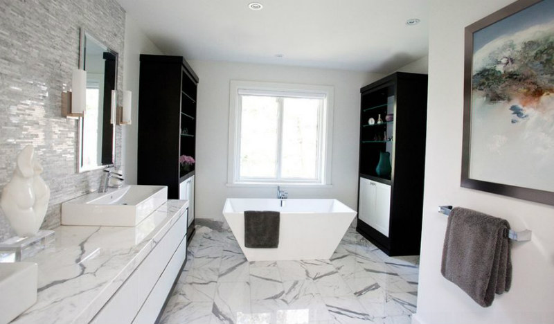 Die Luxusbadezimmerbilder in Foto 4 und Foto 5 werden zweifellos in die Klasse der Luxusbäder passen. Aber achten Sie darauf, wie viele Wände unverkleidet bleiben! Und hier prägt sich Marmor grundlegend in den Raum ein. Außerdem definiert der Farbkontrast zwischen den beiden Begriffen - Schwarz und Weiß - nicht nur einen modernen Stil, sondern auch eine Umgebung, in der der Blick sofort ruht, weil die Augen keiner chromatischen Aggression ausgesetzt sind. Das Badezimmer muss ein Ort der Entspannung sein, oder?