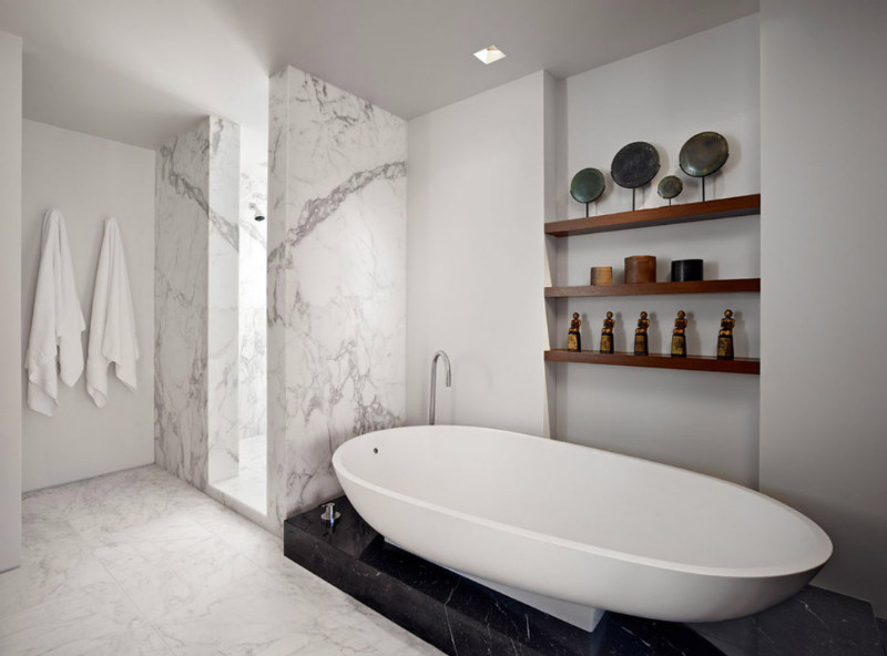 Marmor spielt hier die Hauptrolle und wie man unschwer erkennen kann, müssen wir nicht einmal den ganzen Raum mit Naturstein verkleiden. Wir müssen einfach Platz für den verkleideten Bereich lassen, damit der Stein über die gesamte Umgebung „atmen“ kann.