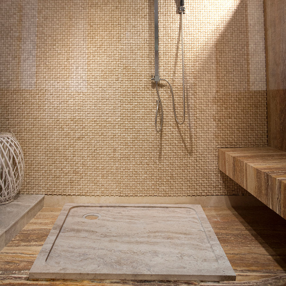 Travertin ist auch in klassischen oder "silbernen" Farbtönen erhältlich, perfekt für ein modernes Badezimmer mit leicht maskulinem Touch. Der silberne Farbton von Travertin vermittelt eine angenehme und imposante Härte und verwandelt die Duschwanne Ihres Badezimmers in den Star des Raumes. Diese Option passt perfekt zu beigen oder cremefarbenen Möbeln oder verschiedenen warmen / pastellfarbenen Farben.
