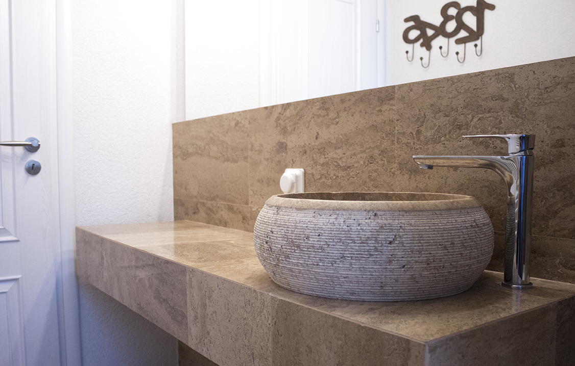 Ein Gefäß-Waschbecken mit geraden Linien ist perfekt für eine Badezimmergestaltung im traditionellen, minimalistischen oder klassischen Stil. Ein Waschbecken aus Naturstein, ergänzt durch ein geradliniges Design, verleiht jedem Badezimmer ein natürliches, authentisches Bild.