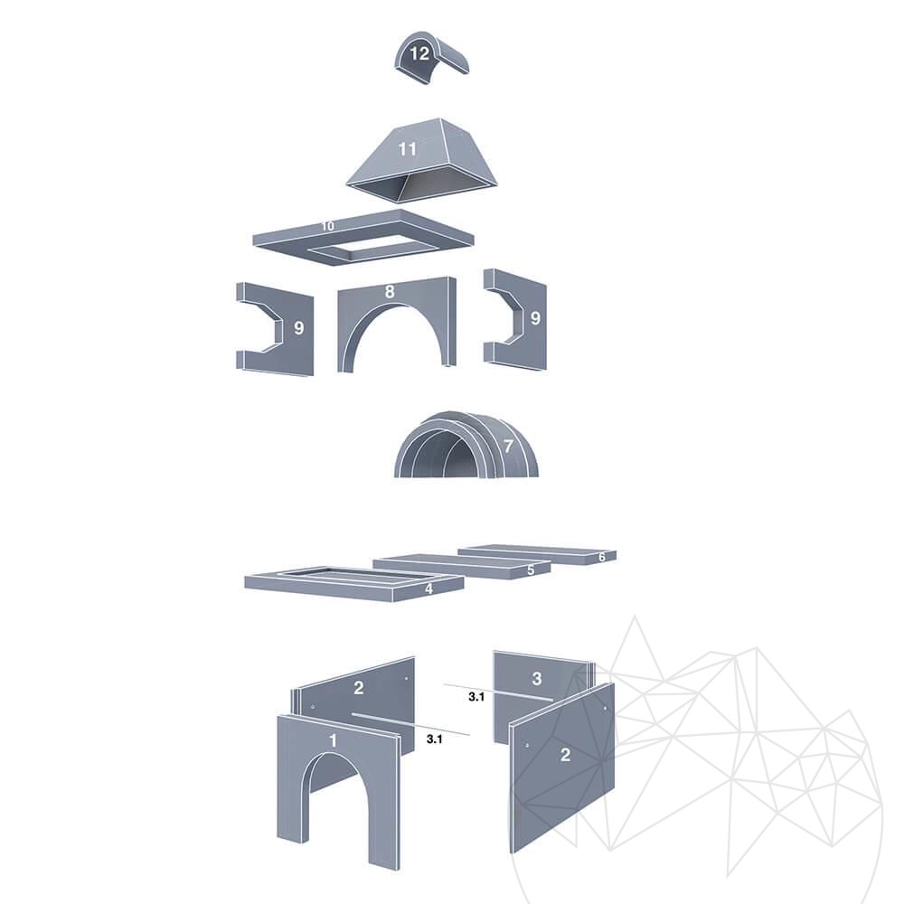 Die Kuppel und die Feuerkammer bestehen aus Schamotteziegeln und Stahlbeton. Diese beiden bilden die Grundstruktur des Grill + Ofen-Ensembles, das außen mit dekorativem Naturstein verkleidet ist (Kalkstein Vratza Splitface 7 cm x LL). Fügen Sie darauf einen Stahldeckel zum Schließen des Ofens beim Erhitzen hinzu, um die Mahlzeit gleichmäßig zu kochen. Alle Elemente werden zusammen mit einem thermoresistenten Klebstoff (Weber SuperFlex 25 kg) fixiert und bei der Lieferung wird das Produkt von einer detaillierten Montageanleitung begleitet, so dass es unter optimalen Bedingungen installiert werden kann.