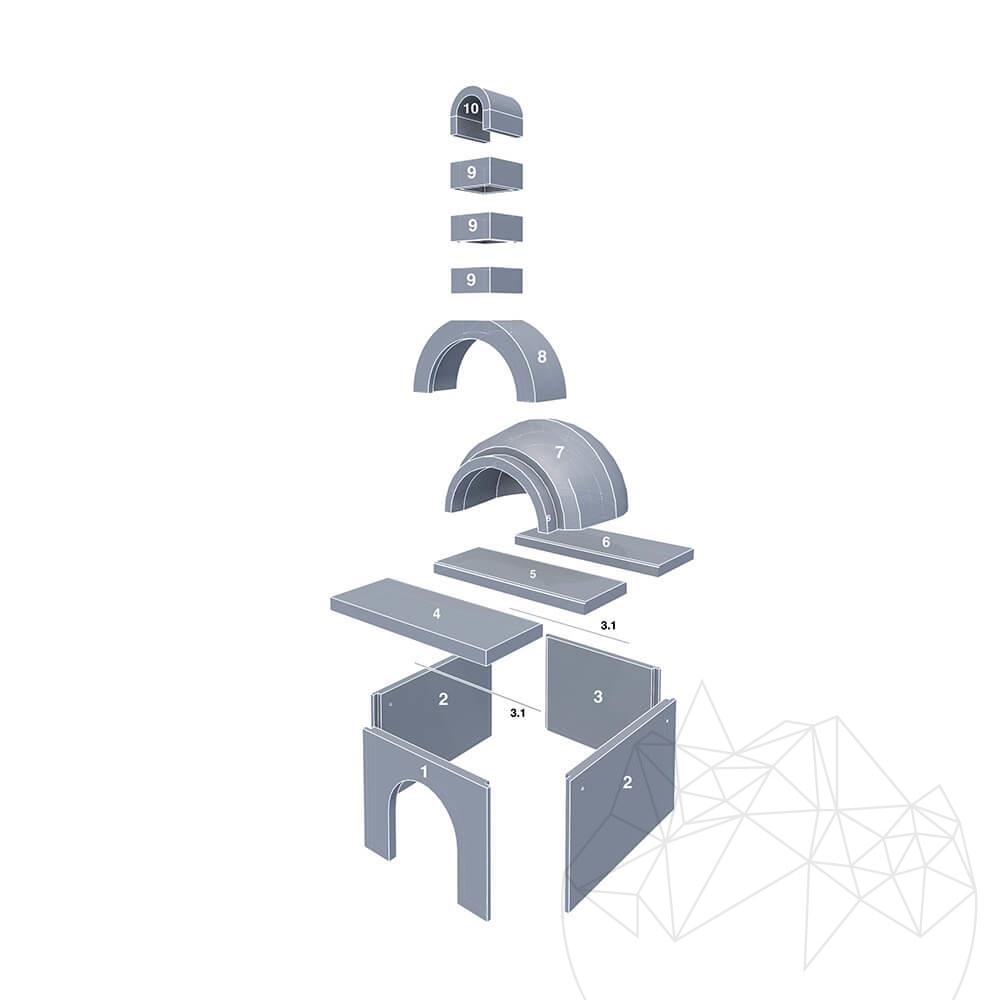 Installationsanleitung: Der Ofen wird auf einer stabilen, ebenen und festen Plattform installiert und die einzelnen Komponenten werden in der in der Anleitung dargestellten Reihenfolge mit einem Zementkleber zusammengefixt. Wenn Sie die Komponenten innerhalb und um die Kuppel herum montieren, wählen Sie einen hitzebeständigen Klebstoff. Für eine gute Haftung stellen Sie sicher, dass die Teile gut bewässert sind; Reinigen Sie nach dem Verbinden alle Oberflächen. Der Ofen ist nach dem Austrocknen des Klebstoffs einsatzbereit, was je nach Jahreszeit zwischen 3 und 5 Stunden dauert.